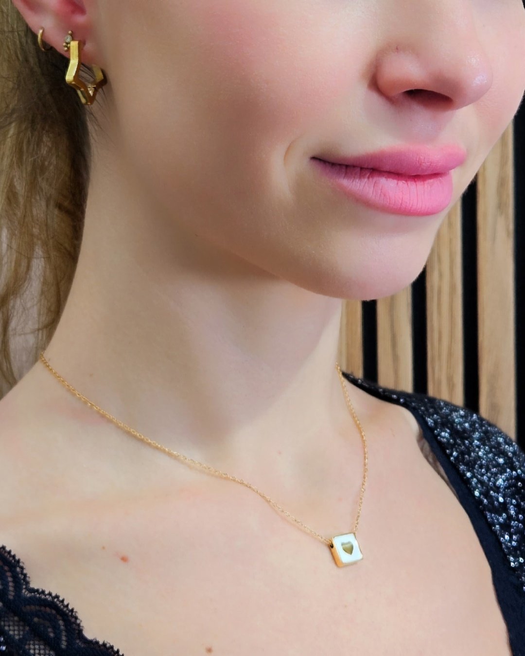 Un collar de corazón 💖 con detalle de nacar. Este colgante de corazón será tu próxima obsesión, combínalo con tus otras cadenas de oro, o si es tu único amor, llévalo solo. ✨