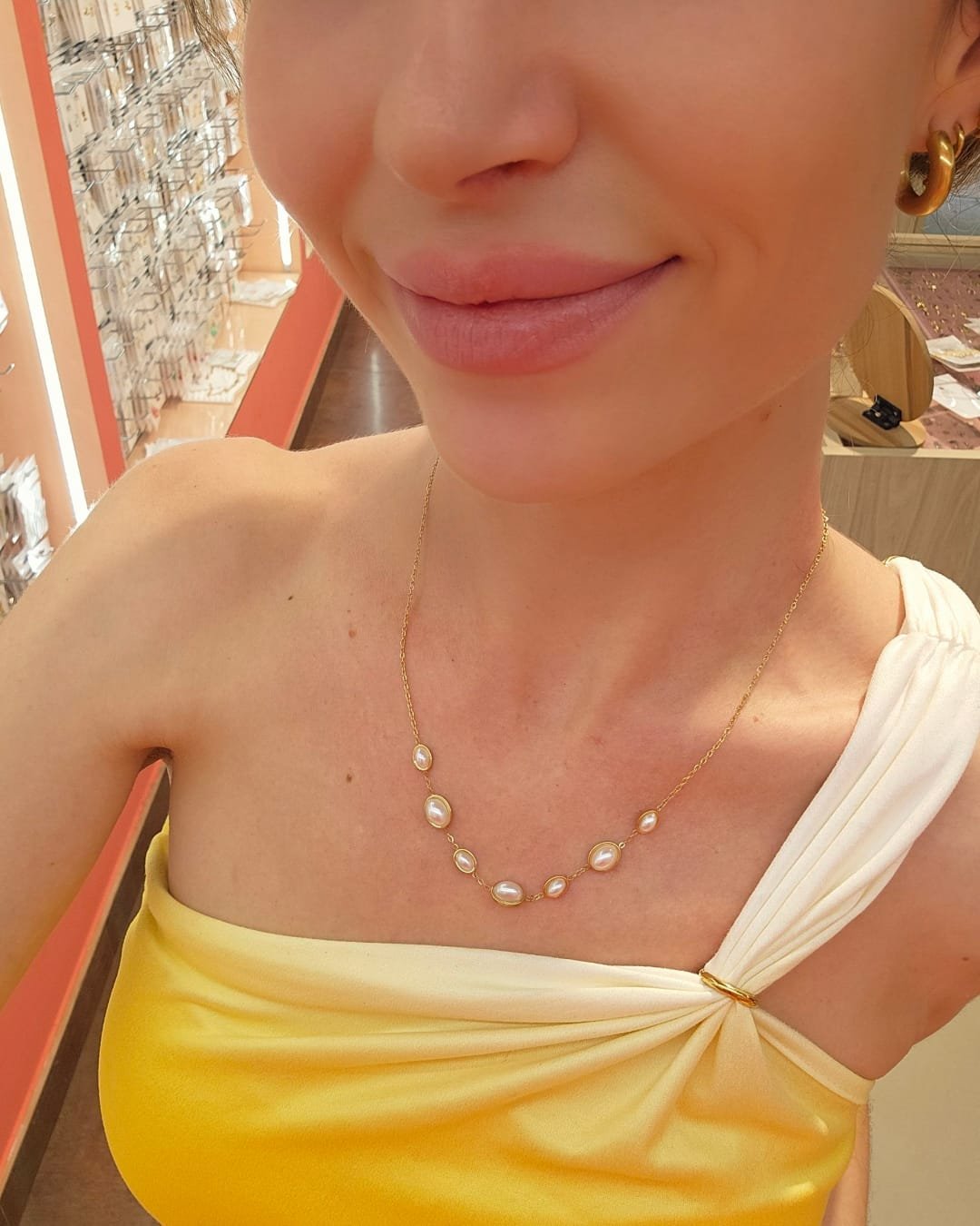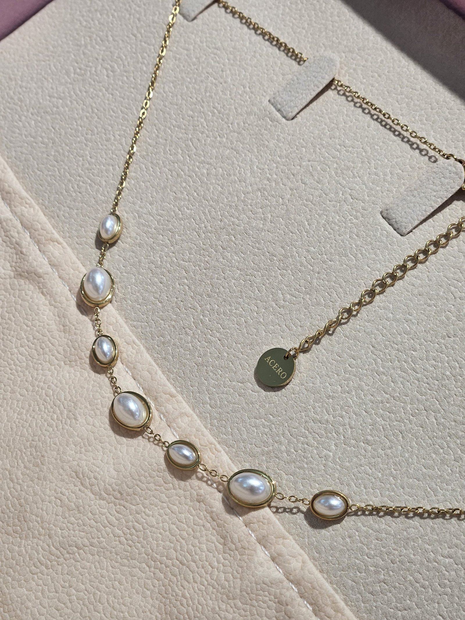 Este collar de la imagen es una pieza delicada y elegante de acero inoxidable con baño dorado. El diseño presenta una cadena fina y ligera que sostiene una serie de perlas ovaladas blancas distribuidas de forma simétrica en el centro del collar. Las perlas están engastadas individualmente en pequeños marcos dorados que les dan un acabado sofisticado y refinado.