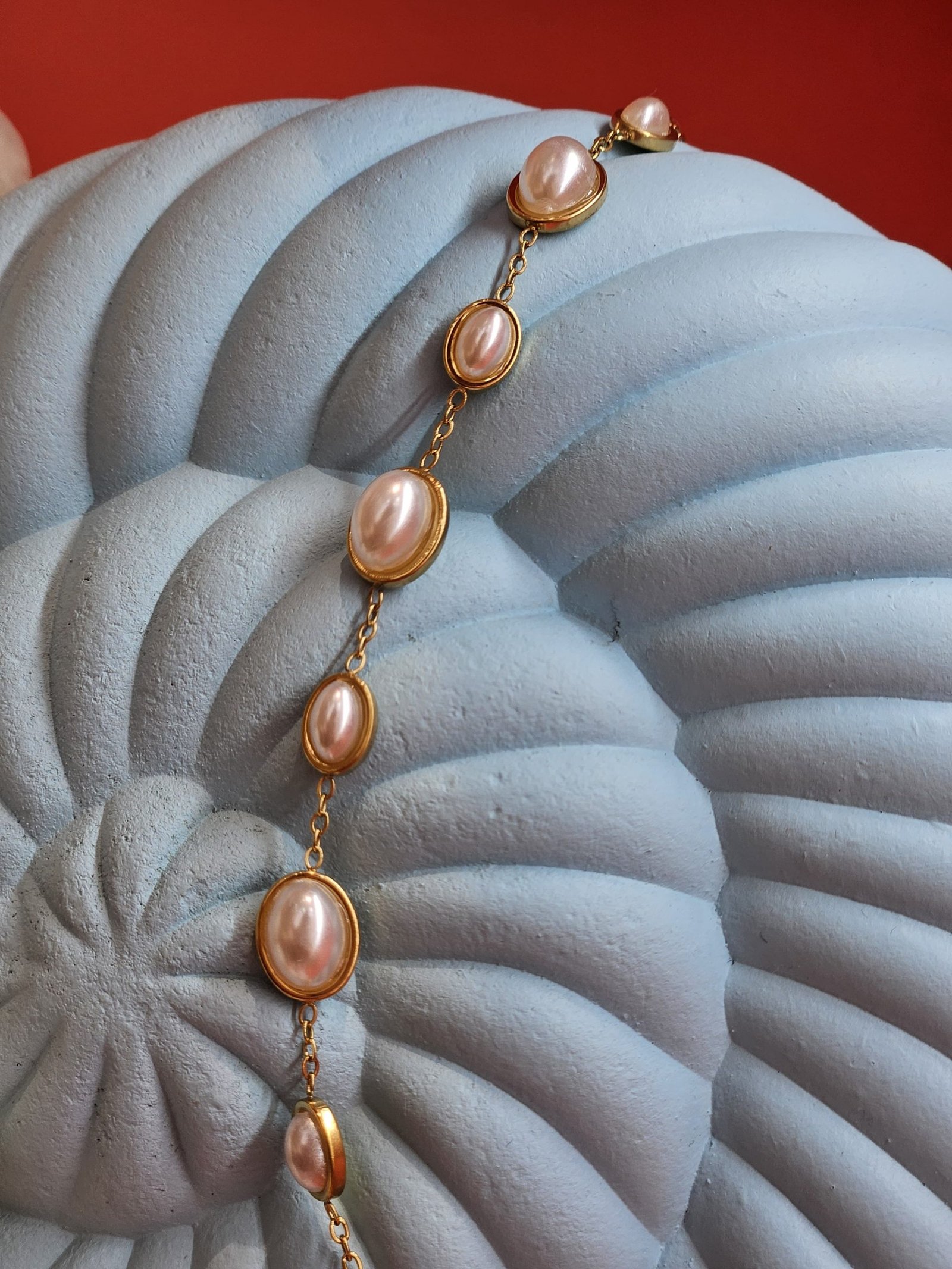 Adornos: Perlas ovaladas tipo nácar, con un brillo suave y natural.