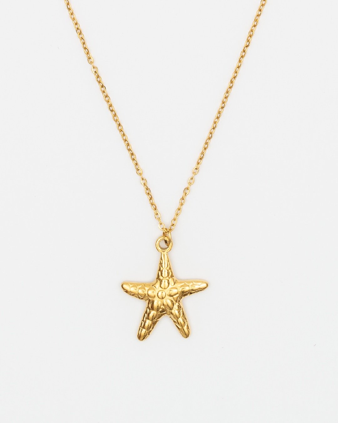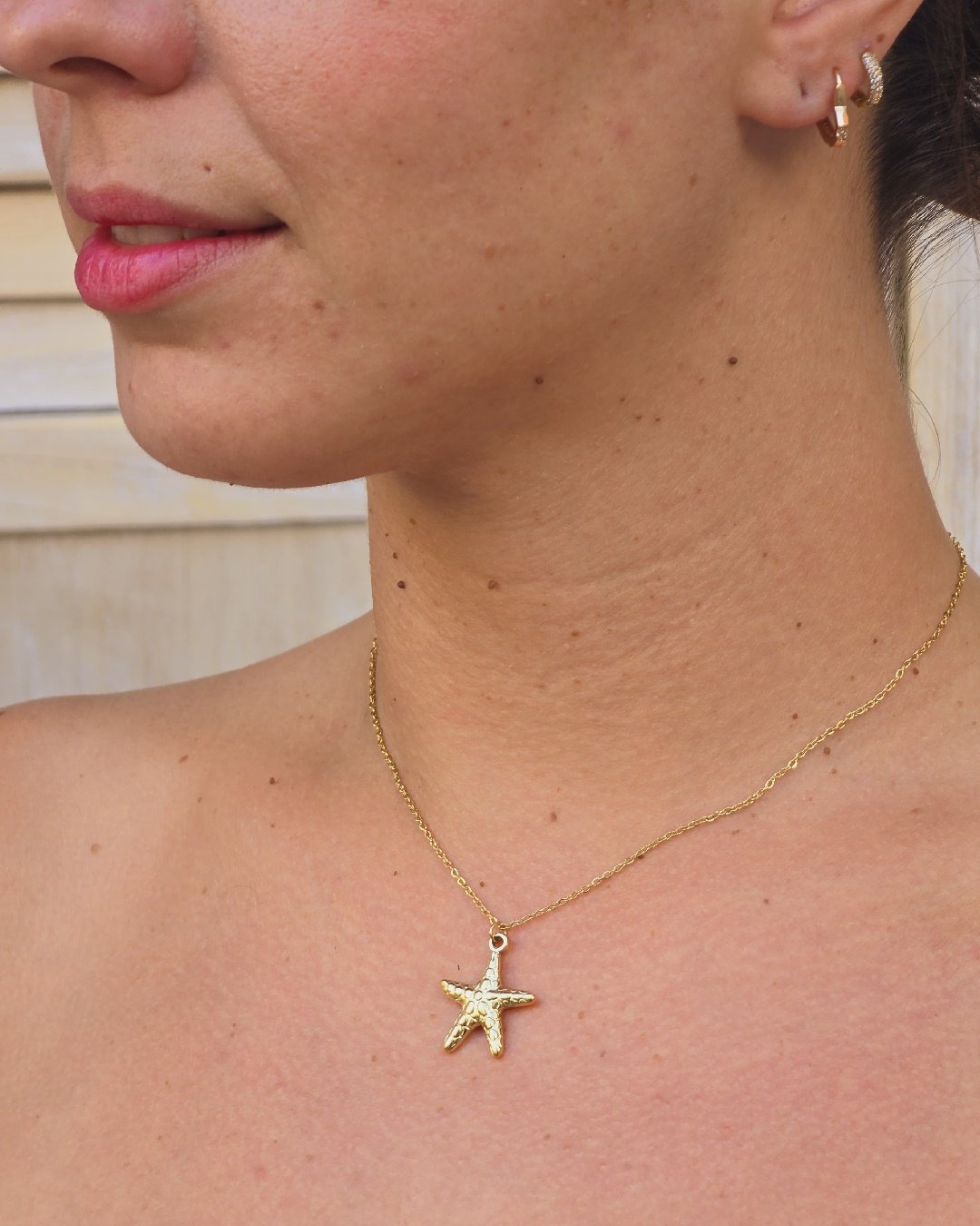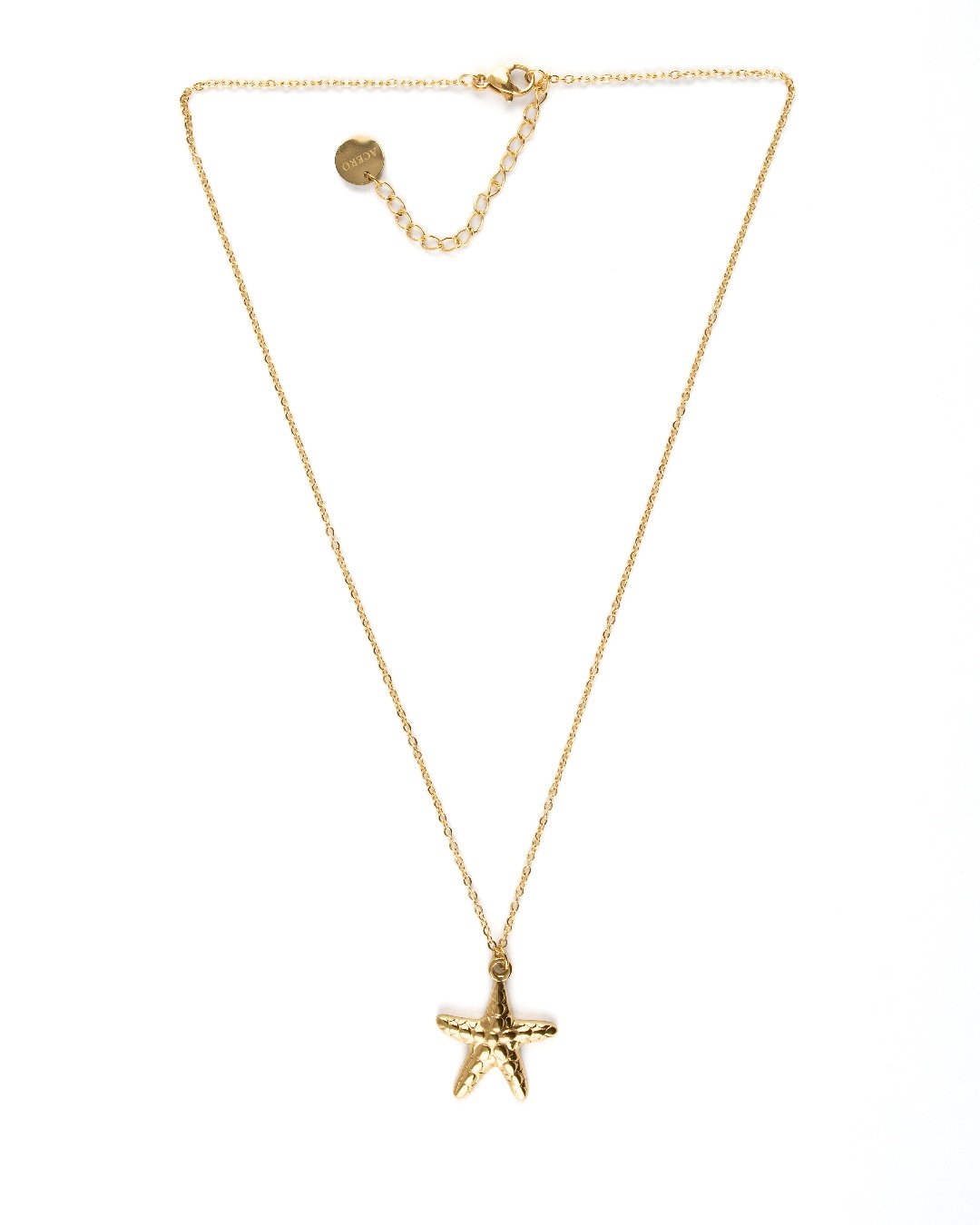 Este collar lleva un charm de colgante de una preciosa estrella de mar. Destacará en tu cuello por la forma tan viscosa y original que tiene. Fabricado con acero inoxidable y baño de oro de alta calidad, nuestros collares garantizan una durabilidad excepcional. 100% Waterproof