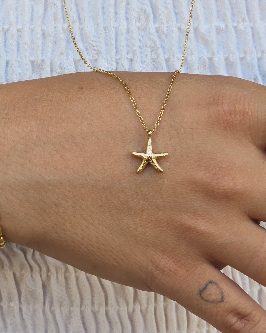 El Collar Estrella de mar mini es una cadena fina de la que cuelga una estrella de mar preciosa que convertirá tu layering en único.✨ Es perfecto para brillar en cualquier noche de verano, ¡te vas a enamorar!💖 Fabricado con acero inoxidable y baño de oro de alta calidad, nuestros collares garantizan una durabilidad excepcional. 100% Waterproof