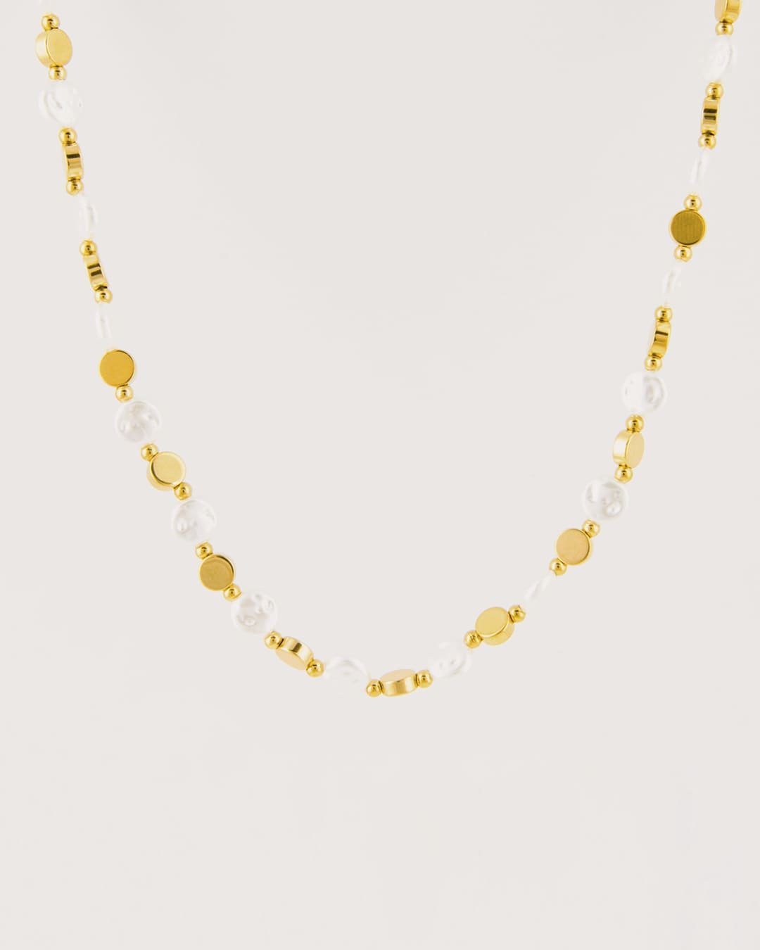 Este collar combina la modernidad del acero con la elegancia clásica de las perlas, creando una pieza de joyería versátil que se adapta tanto a ocasiones formales como informales. Las perlas a menudo se asocian con la pureza y la feminidad, mientras que el acero dorado añade un toque de lujo y calidez. El diseño intercalado puede simbolizar la armonía entre lo moderno y lo clásico.
