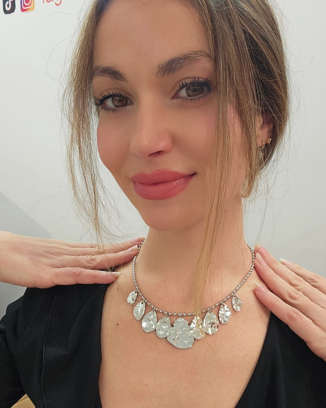 El collar tiene una estructura equilibrada que se adapta al cuello de forma natural. Cada elemento refleja la luz de manera distinta, logrando un efecto sofisticado y contemporáneo. Es resistente al agua, no se oxida y es apto para piel sensible.