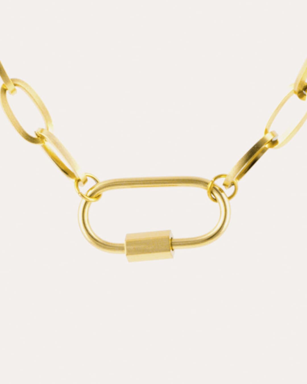 Este collar de acero de eslabones con un mosquetón como pieza central es una joya audaz y moderna. La combinación de la robustez de los eslabones de acero con la forma distintiva del mosquetón crea un equilibrio entre la fuerza y la estética contemporánea. Este collar sería adecuado para aquellos que buscan una pieza de joyería única y vanguardista que llame la atención. Fabricado con acero inoxidable y baño de oro de alta calidad, nuestros collares garantizan una durabilidad excepcional. 100% Waterproof