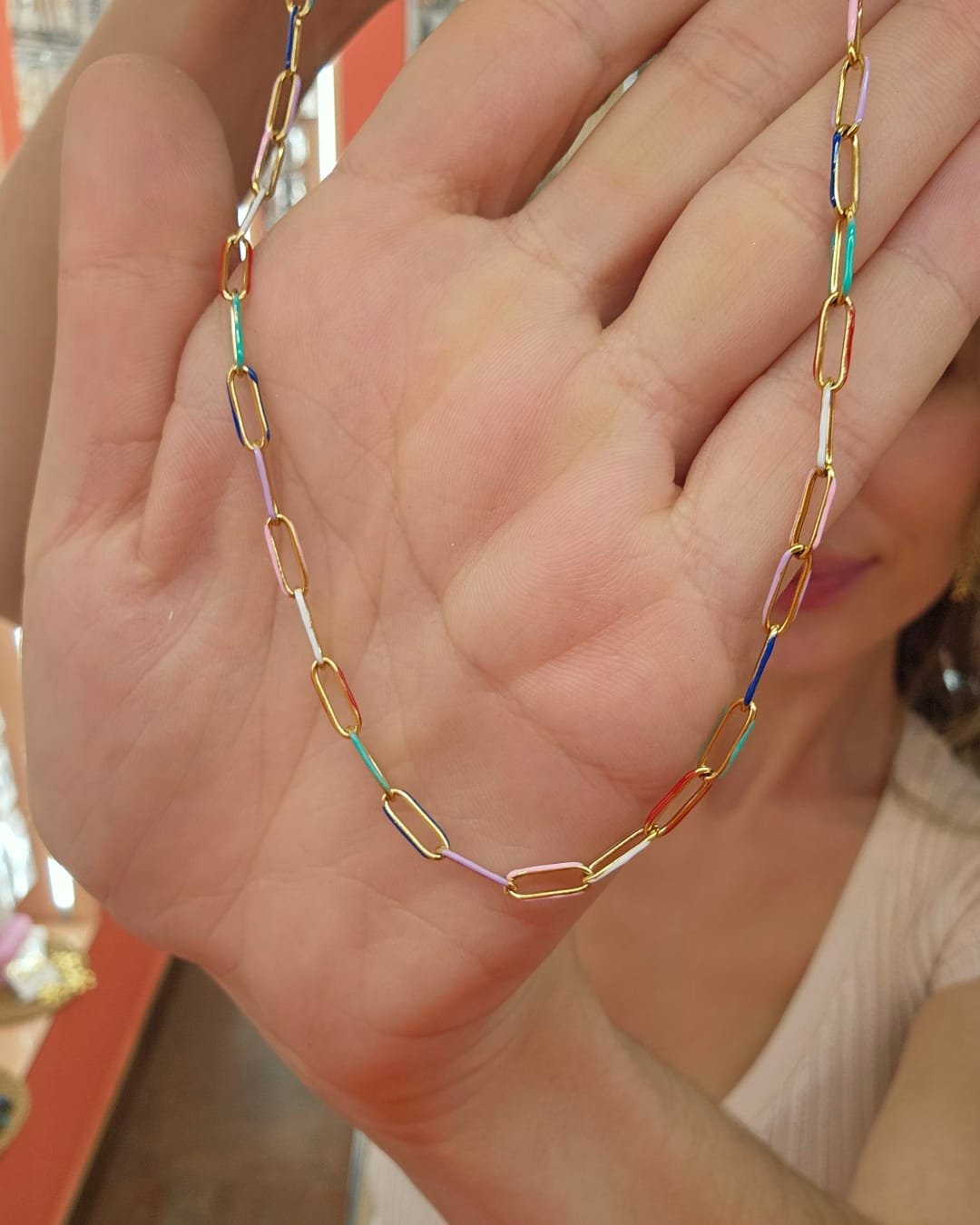 El Collar Eslabones Arcoíris es un diseño moderno con eslabones esmaltados en tonos pastel y dorado. Hecho en acero inoxidable con baño de oro 18K, es resistente al agua y al desgaste. Incluye una cadena ajustable de 5 cm para adaptarlo a tu estilo. Perfecto para mujeres modernas, creativas y llenas de energía.