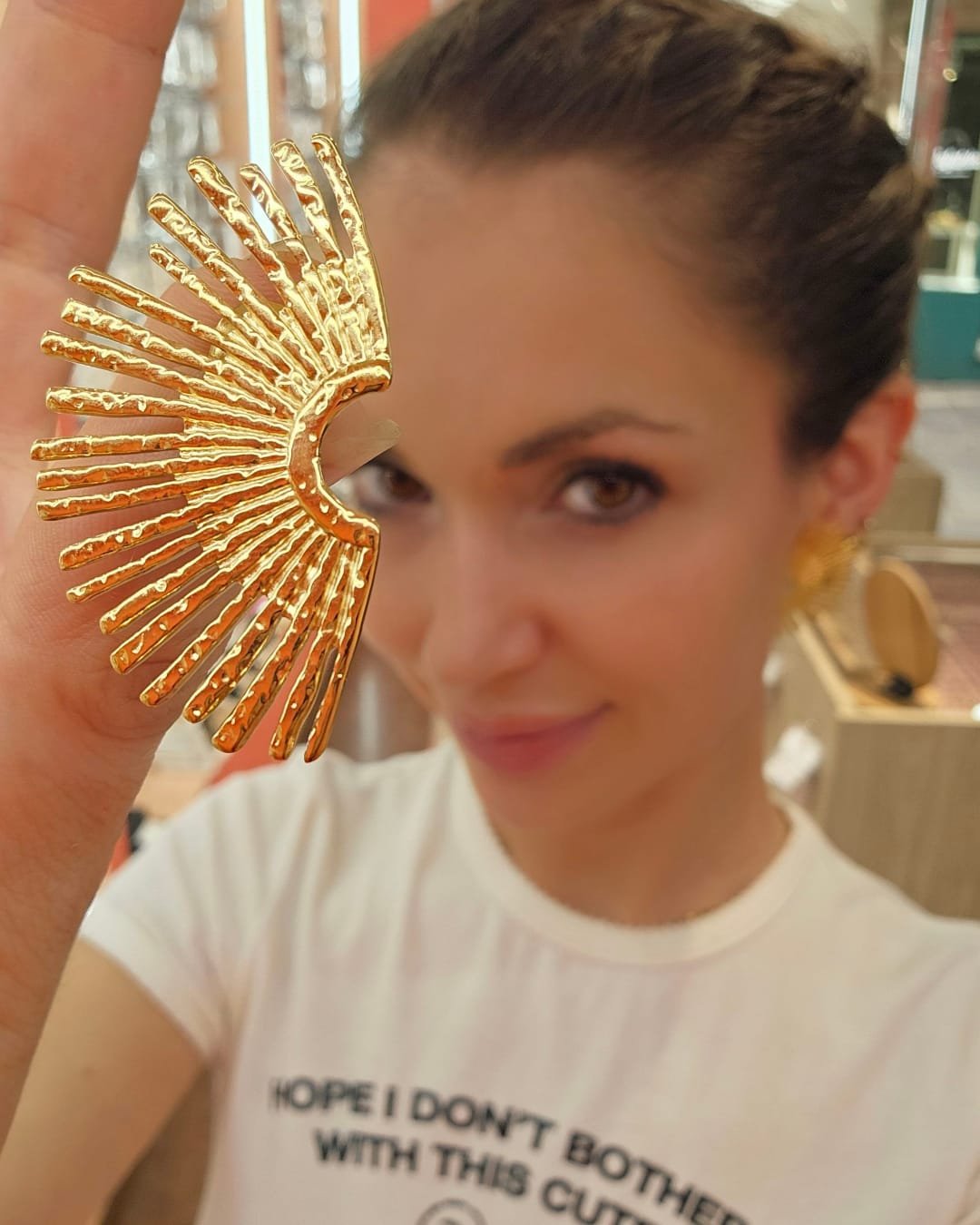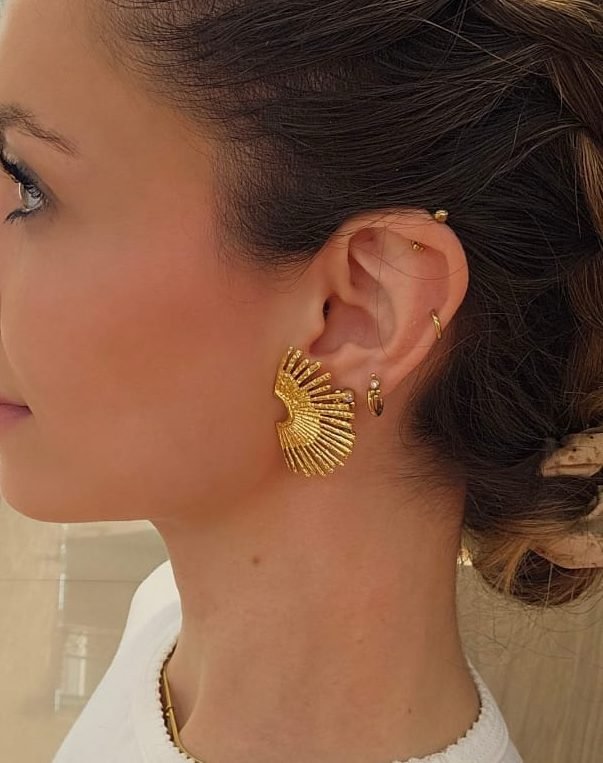 Destaca con los Pendientes Sunbeam, un diseño original y lleno de estilo que combina la forma de un medio sol con un delicado abanico. 🌞🌸