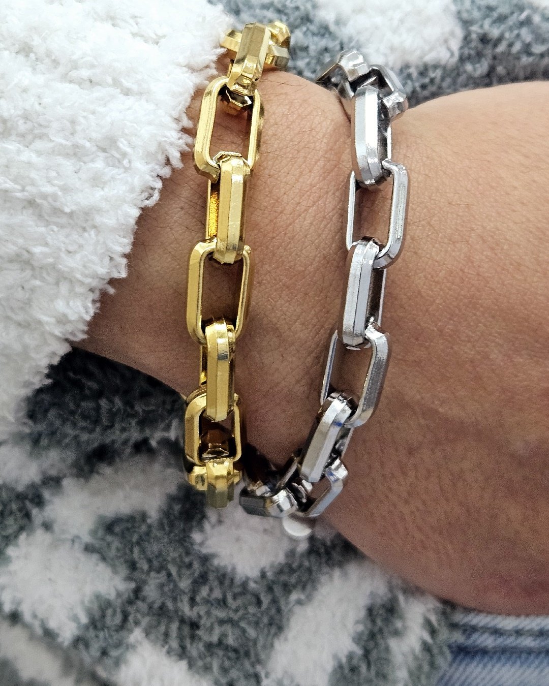 Una pulsera de eslabones grandes, perfecta para llevar como brazalete de diario. Combinala con cualquiera de tus joyas. Fabricado con acero inoxidable y baño de oro de alta calidad ✨, nuestra pulsera garantiza una durabilidad excepcional y una resistencia impecable al desgaste diario. Su diseño ajustable permite adaptarse a varias medidas de muñeca. 100% Waterproof🌊