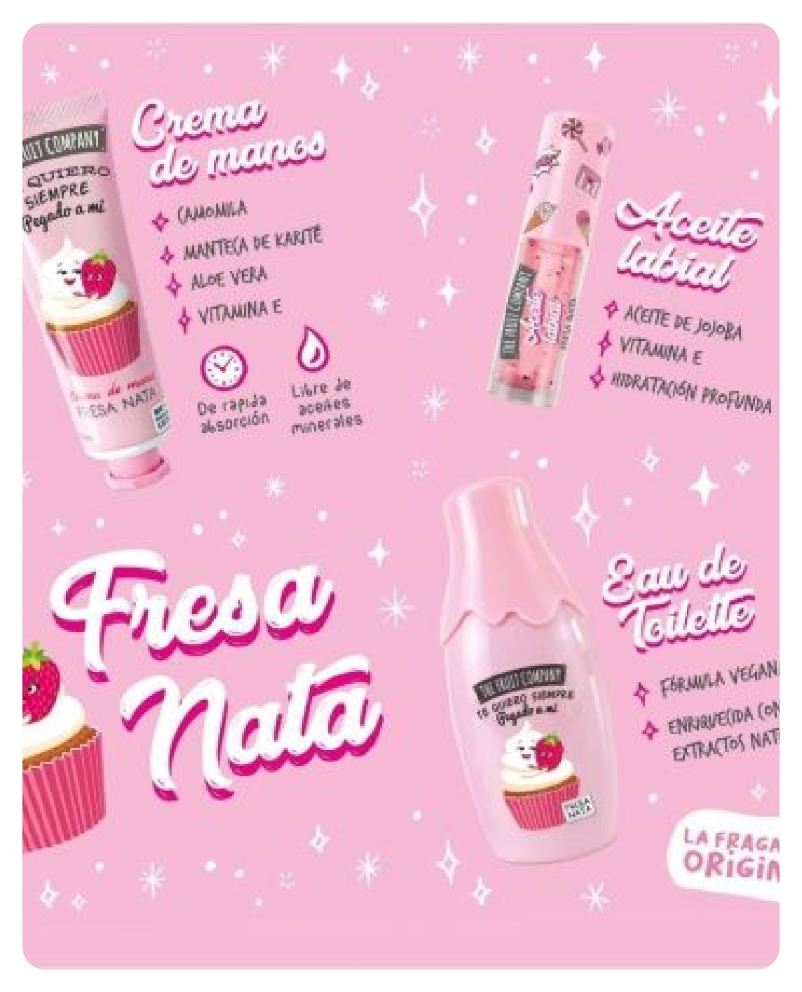 Además podrás disfrutar de nuestra Eau de Toilette con la fragancia original de fresa nata, enriquecido con extractos naturales y una fórmula vegana. Y para que puedas llevar todos estos maravillosos productos contigo a donde vayas, te incluimos un neceser de mano con un diseño divertido y práctico.